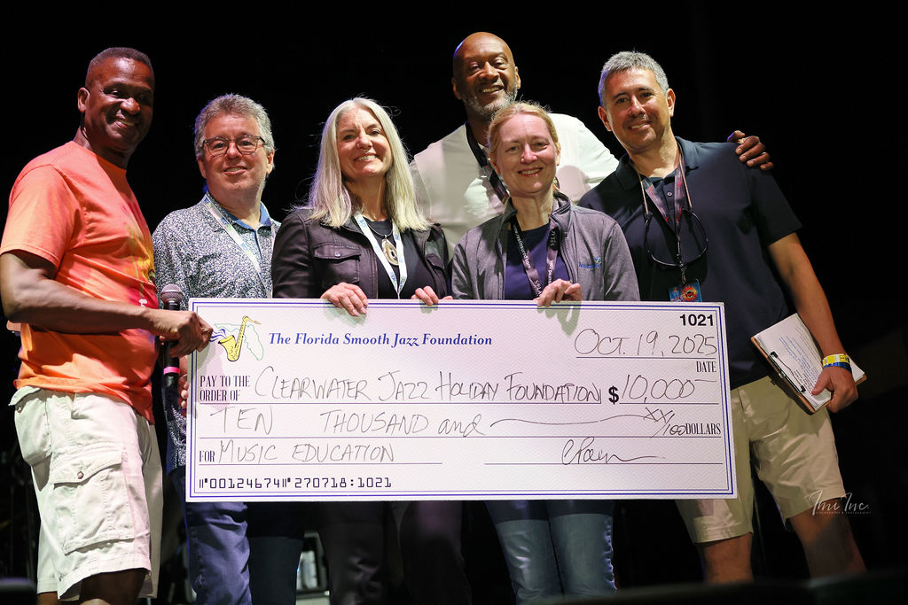 CLEARWATER JAZZ HOLIDAY FOUNDATION, INC. IS A QUALIFIED 501(c)(3) NONPROFIT ORGANIZATION. CONSULT YOUR TAX ADVISOR. YOUR CONTRIBUTIONS ARE TAX DEDUCTIBLE TO THE AMOUNT ALLOWED BY LAW. A COPY OF THE OFFICIAL REGISTRATION AND FINANCIAL INFORMATION MAY BE OBTAINED FROM THE DIVISION OF CONSUMER SERVICES ONLINE AT WWW.FLORIDACONSUMERHELP.COM OR BY CALLING TOLL-FREE WITHIN THE STATE 1-800-HELP-FLA (1-800-435-7352). REGISTRATION DOES NOT IMPLY ENDORSEMENT, APPROVAL, OR RECOMMENDATION BY THE STATE. FLORIDA REGISTRATION # CH15231