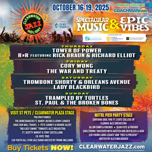 CLEARWATER JAZZ HOLIDAY FOUNDATION, INC. IS A QUALIFIED 501(c)(3) NONPROFIT ORGANIZATION. CONSULT YOUR TAX ADVISOR. YOUR CONTRIBUTIONS ARE TAX DEDUCTIBLE TO THE AMOUNT ALLOWED BY LAW. A COPY OF THE OFFICIAL REGISTRATION AND FINANCIAL INFORMATION MAY BE OBTAINED FROM THE DIVISION OF CONSUMER SERVICES ONLINE AT WWW.FLORIDACONSUMERHELP.COM OR BY CALLING TOLL-FREE WITHIN THE STATE 1-800-HELP-FLA (1-800-435-7352). REGISTRATION DOES NOT IMPLY ENDORSEMENT, APPROVAL, OR RECOMMENDATION BY THE STATE. FLORIDA REGISTRATION # CH15231