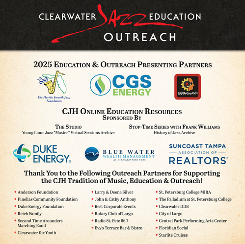 CLEARWATER JAZZ HOLIDAY FOUNDATION, INC. IS A QUALIFIED 501(c)(3) NONPROFIT ORGANIZATION. CONSULT YOUR TAX ADVISOR. YOUR CONTRIBUTIONS ARE TAX DEDUCTIBLE TO THE AMOUNT ALLOWED BY LAW. A COPY OF THE OFFICIAL REGISTRATION AND FINANCIAL INFORMATION MAY BE OBTAINED FROM THE DIVISION OF CONSUMER SERVICES ONLINE AT WWW.FLORIDACONSUMERHELP.COM OR BY CALLING TOLL-FREE WITHIN THE STATE 1-800-HELP-FLA (1-800-435-7352). REGISTRATION DOES NOT IMPLY ENDORSEMENT, APPROVAL, OR RECOMMENDATION BY THE STATE. FLORIDA REGISTRATION # CH15231